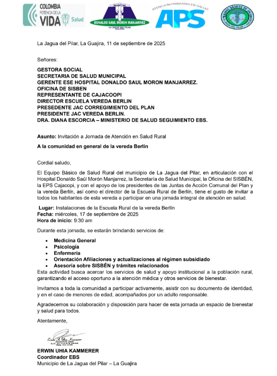 El pasado miercoles primero de octubre de 2025 LOS EQUIPOS BASICOS EN SALUD estuvieron haciendo presencia EN LA ZONA RURAL VEREDA EL PIÑAL llevando la salud a cada uno de los rincones de nuestro bello municipio en el HOSPITAL DONALDO SAUL MORON MANJARREZ de la Jagua del Pilar seguimos trabajando por la salud de todos sus habitnates.